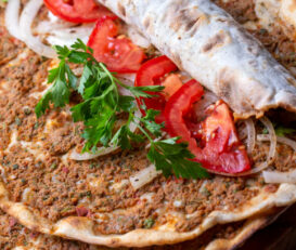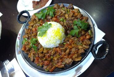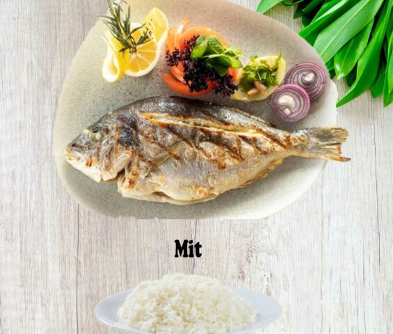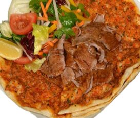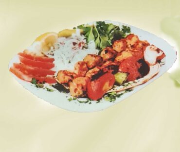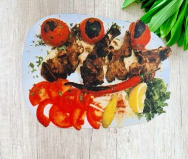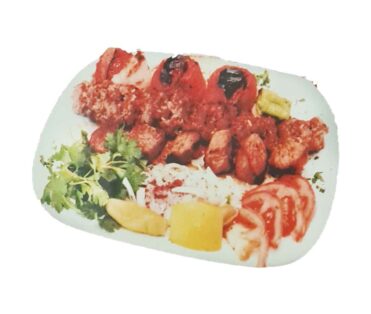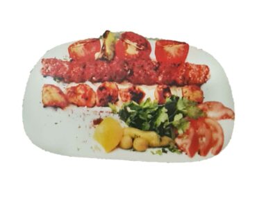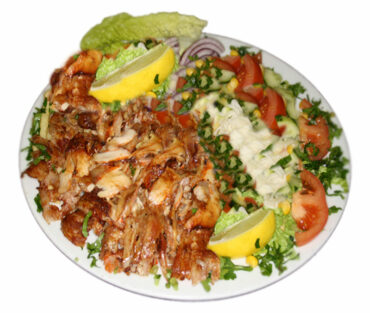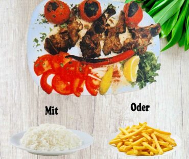2 Hackfleisch, 1 Lamm, 1 Hähnchenspieß, Lammkotelett, Hähnchenkeule, gegrillten Tomaten und Salat oder Reis