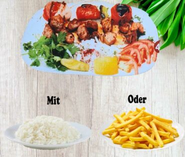 2 Spieße Hänchen und Hackfleischspieße, gegrillte Tomaten, Peperoni und Salat Mit Reis oder Pommes