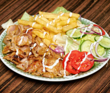 Lamm und Hackfleischspieß, gegerillte Tomaten, Peperonie und Salat mit Pommes oder Reis
